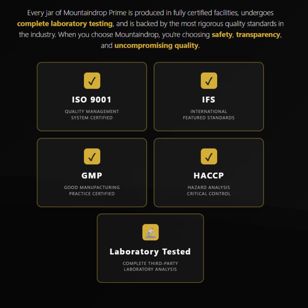 Mountaindrop® Prime contains natural ingredients of the highest quality and they come with the required certifications and tests. Our Original shilajit resin is certified by the HACCP food safety standard since we test every single batch for:
